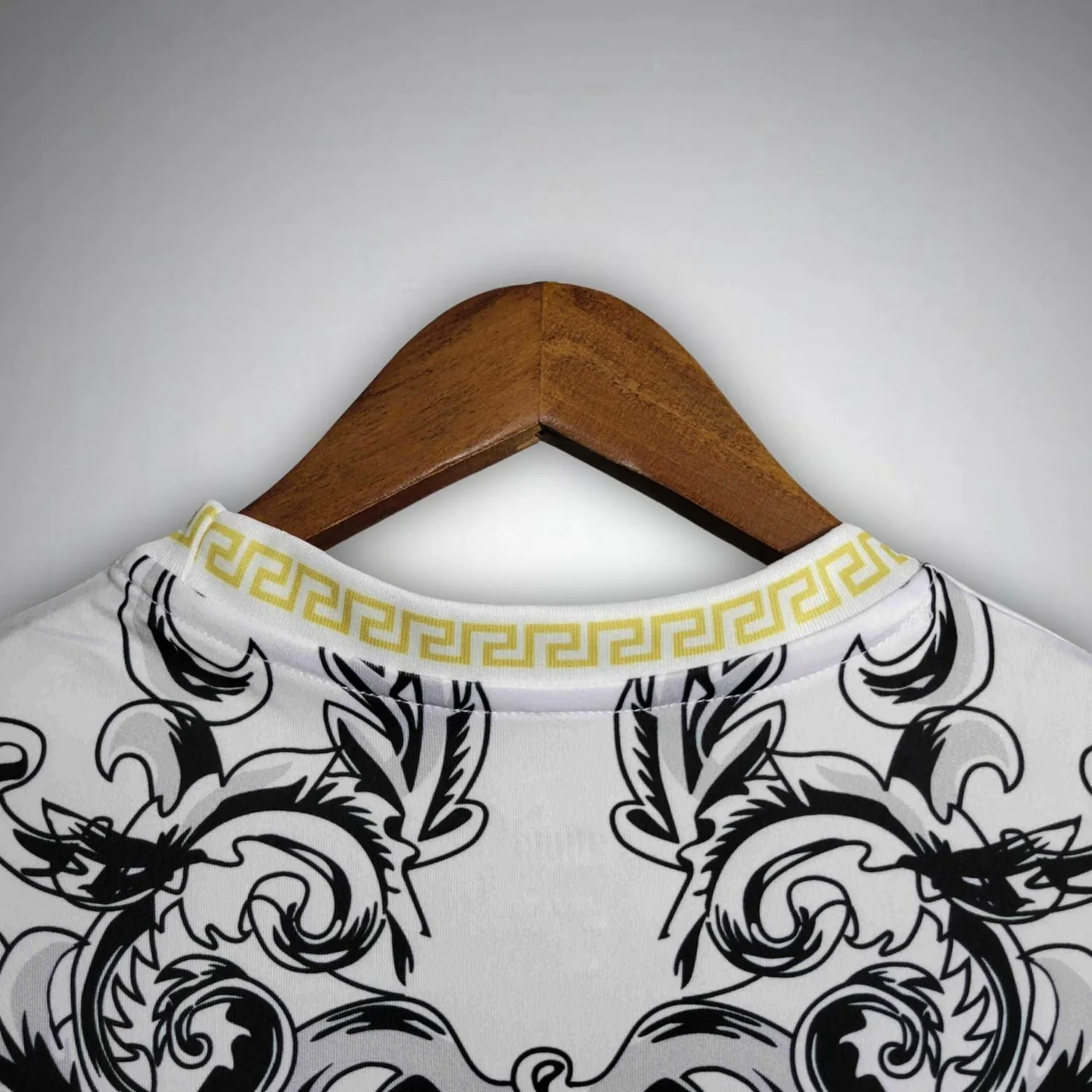 This exclusive white kit fuses Italian football pride with high-fashion luxury. It showcases the iconic Italia crest against a stunning black-and-white baroque pattern. The design is centered by the gold Versace Medusa head and logo, creating an eye-catching, unique garment that elevates fan wear into a stylish statement.
