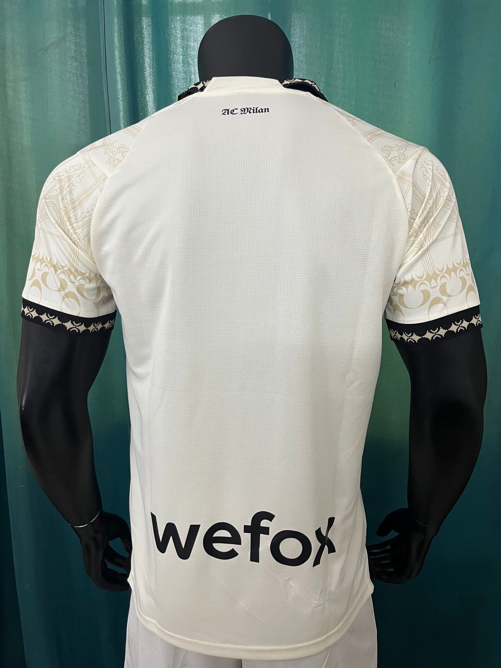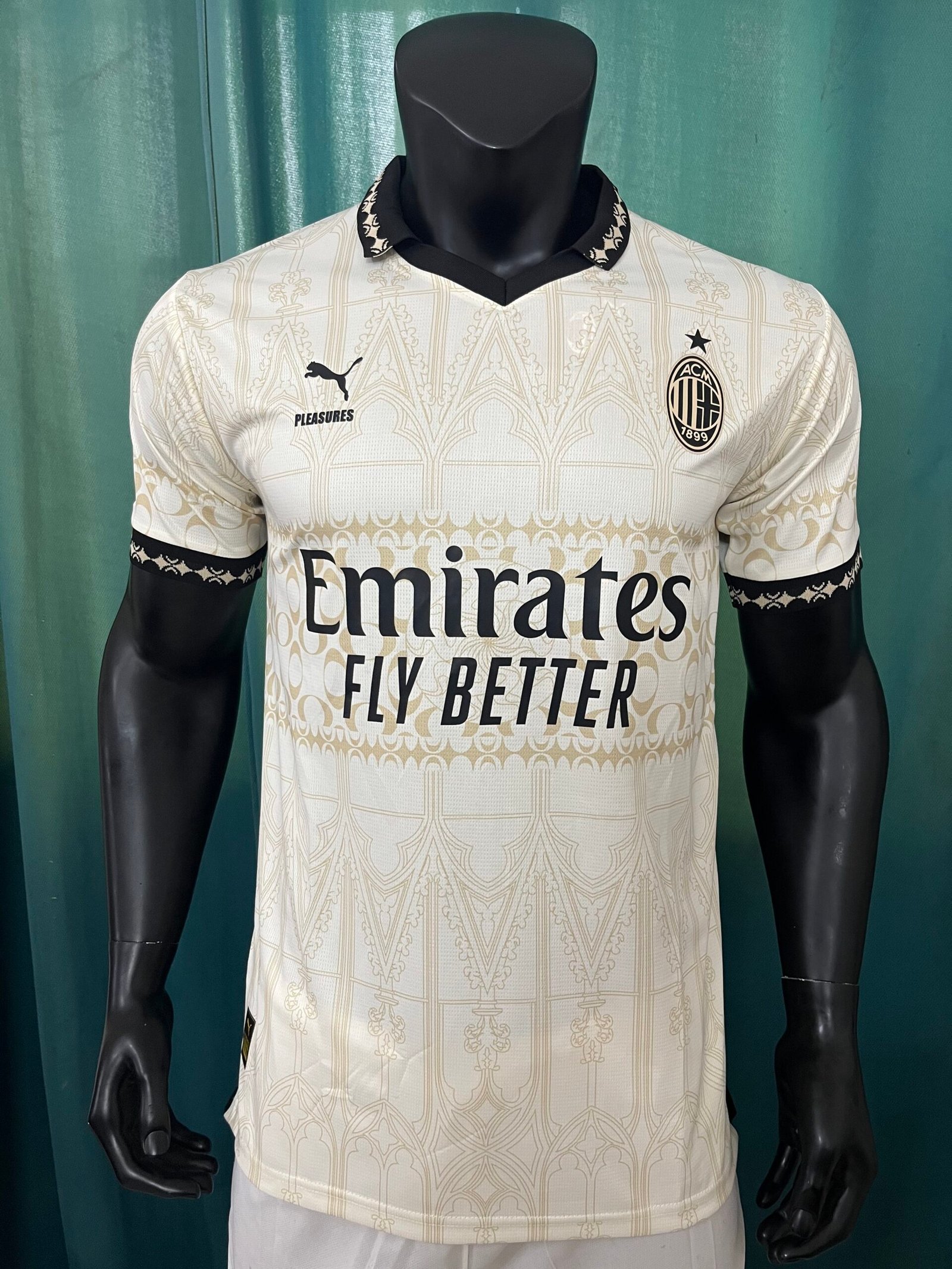 This AC Milan PUMA White and Gold Gothic Jersey stands out in a special collection, with a collaborator like PLEASURES. The white base shines with a detailed, repeating beige and gold graphic. It reminds one of Gothic architecture or cathedral windows. With black trim on the collar and cuffs, this jersey gives AC Milan fans a stylish, standout look. It’s perfect for collectors or anyone wanting a bold statement piece.