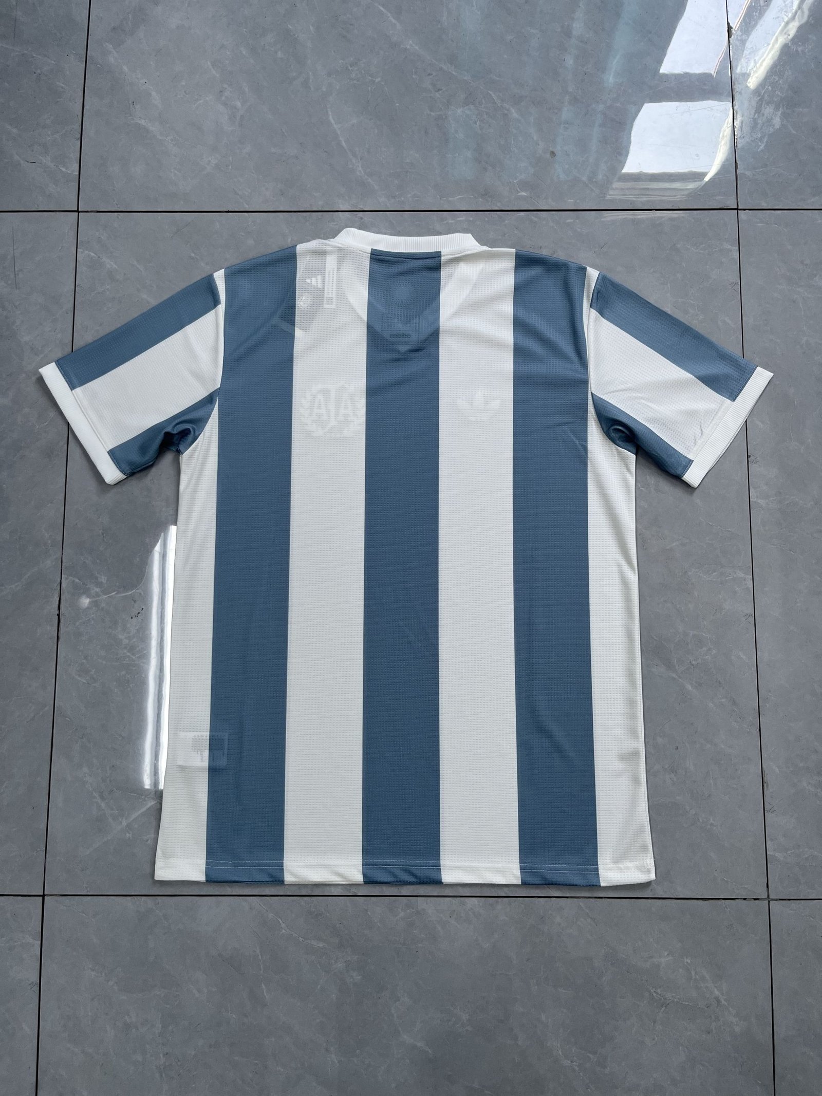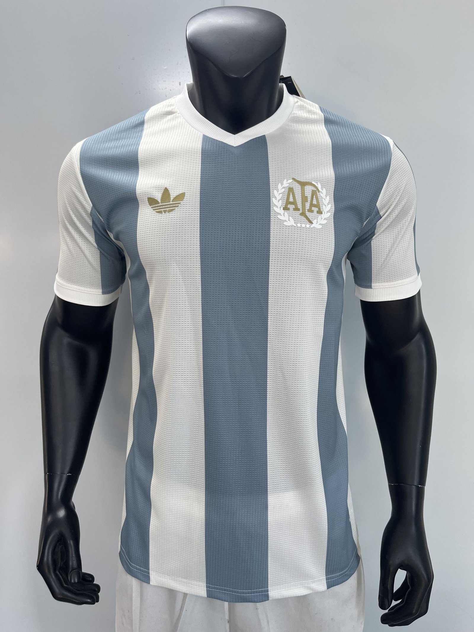 The Argentina Adidas Stripes Jersey pays homage to La Albiceleste’s football legacy. This shirt has the famous sky blue and white stripes. They are instantly recognizable on fields worldwide. It blends classic style with modern performance. It features the iconic Adidas Trefoil logo and a retro team crest, often in a striking gold. This jersey is perfect for collectors and fans. It shows national pride while being both historic and comfy for all-day wear.