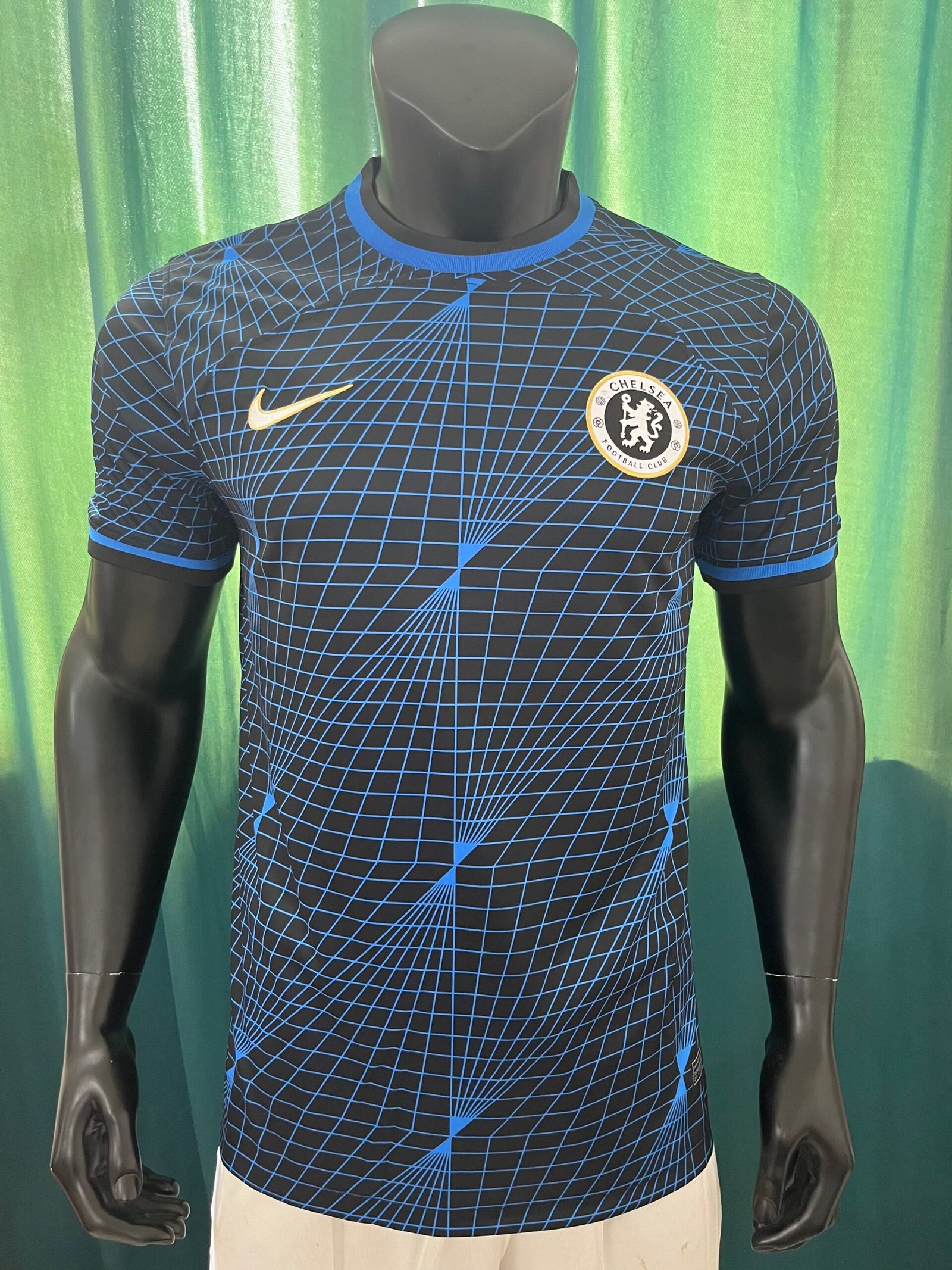 This striking football jersey has a dark, mysterious design. It features a bold graphic pattern with bright blue lines on a black background. It is likely a Chelsea FC away or third kit, featuring the club crest and the iconic white Nike Swoosh. The angular, web-like design gives it a modern, high-tech aesthetic. It looks sharp and offers great comfort and breathability. This makes it a stylish pick for fans who want to stand out and support the Blues.