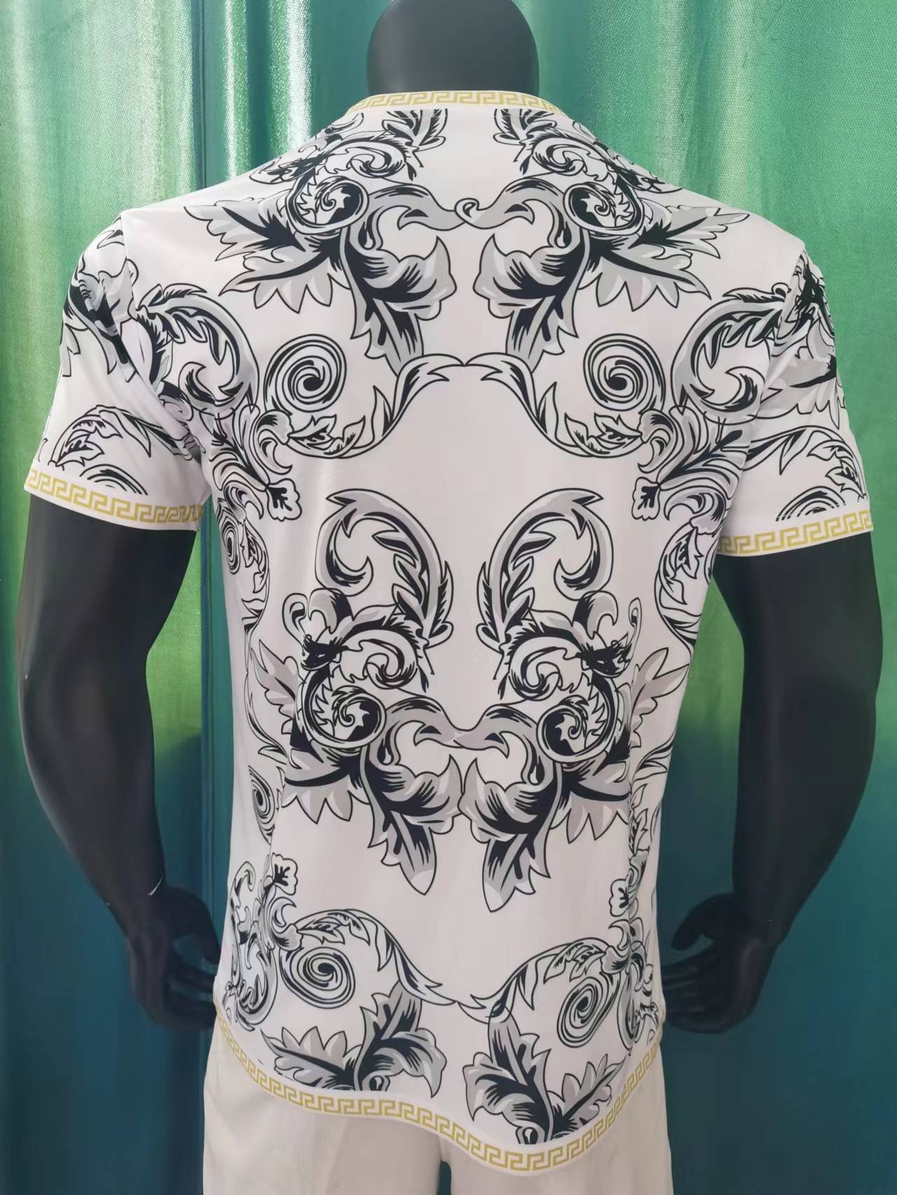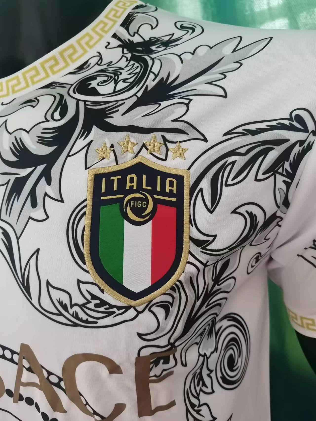 The jersey is an amazing concept. It boldly combines high fashion with international football. This shirt has a bold white and black/gold baroque design. This jersey is an amazing concept. It boldly combines high fashion with international football. This shirt has a bold white and black/gold baroque design. It highlights the famous Versace Medusa head logo at its centre. The detailed, designs complement the gold-trimmed collar and sleeves. These details feature the signature Versace key-pattern border. This piece proudly shows the Italian national team crest (FIGC) and the Puma logo. It’s a collector’s item that celebrates the ‘Azzurri’ with luxury and style.