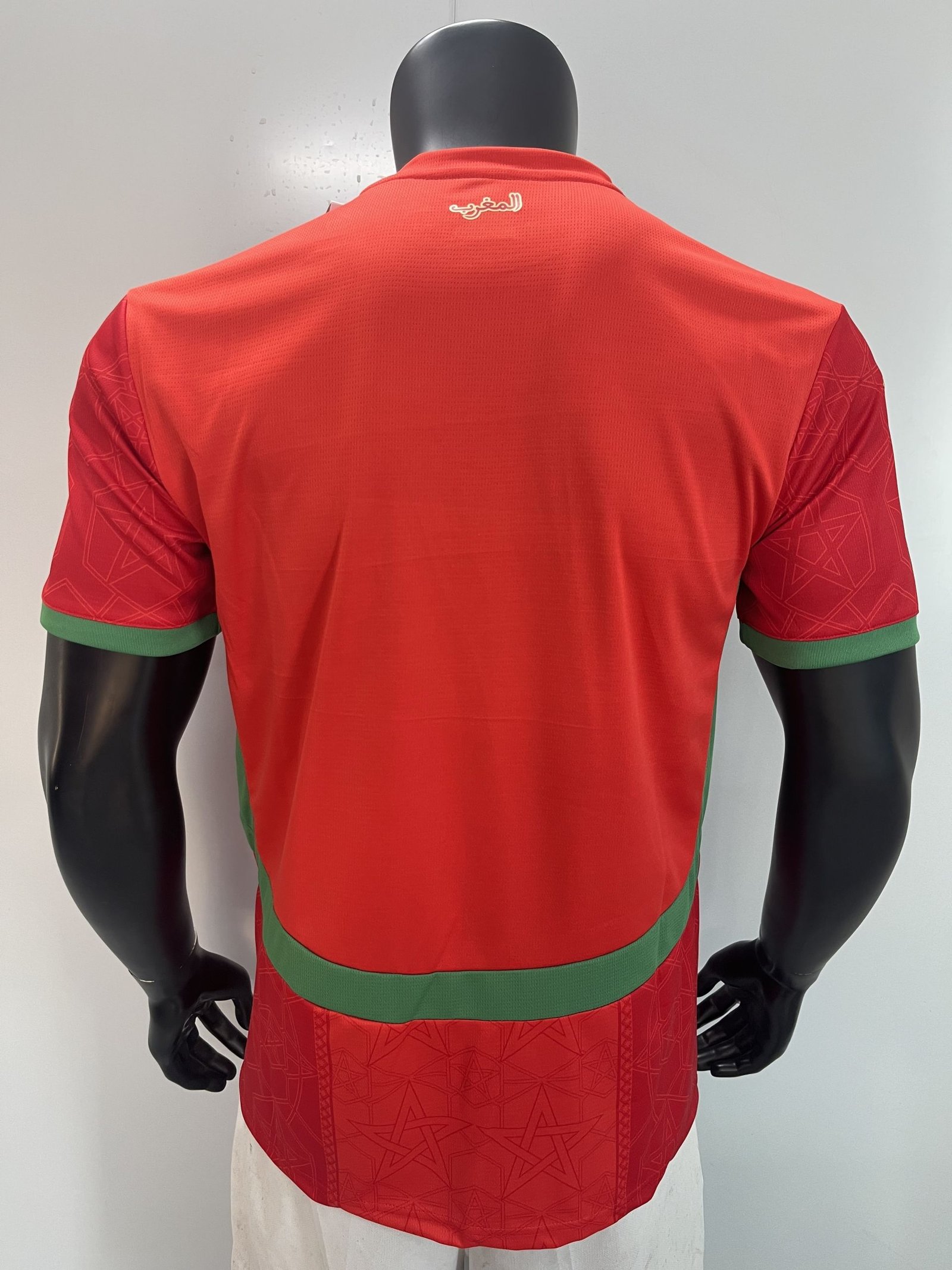 Cheer on the Atlas Lions with a stylish home jersey! this is the same design they wore during the historic world cup celebrations. This classic red jersey has a geometric pattern inspired by Moroccan tiles. It even has a green collar and green sleeves which show confidence on match day.